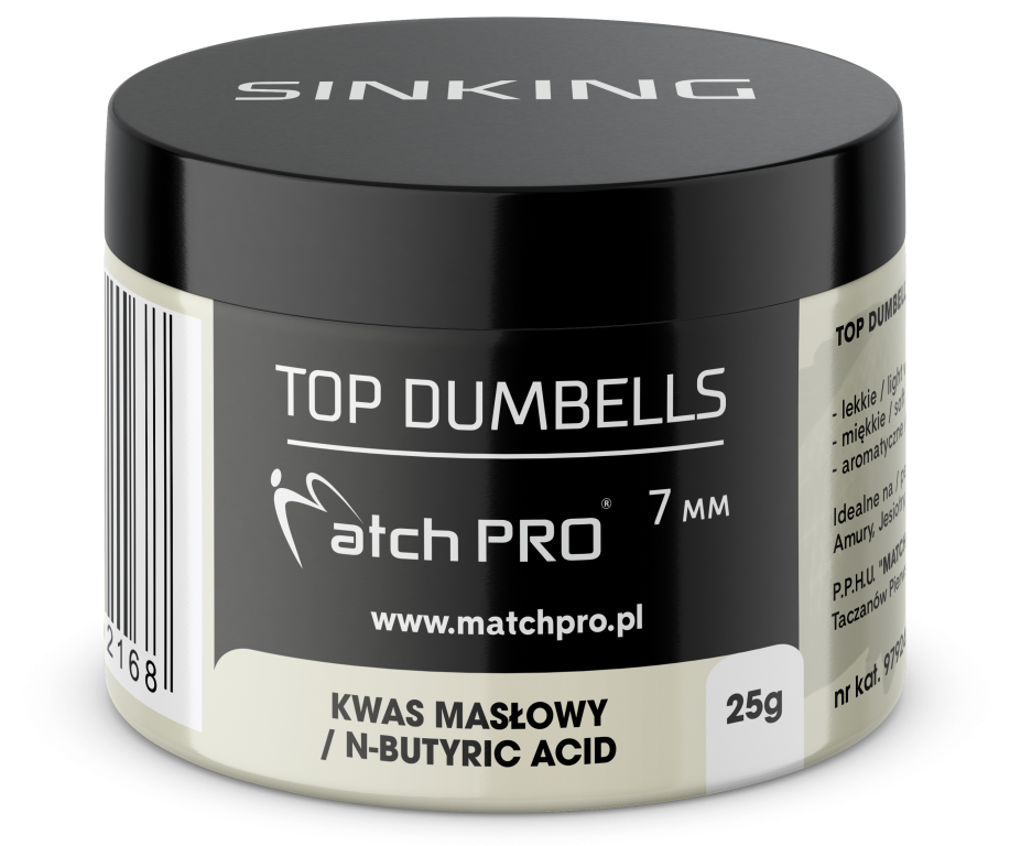 Seria najwyższej jakości przynęt o kształcie wałka (dumbells) w rozmiarze 7mm. Długie i intensywne testy tych przynęt pozwoliły dopracować ich skład i właściwości tak aby były bardzo skuteczne w każdych warunkach. To co wyróżnia Matchpro top dumbells to idealna miękkość, dzięki której ryby pewnie ją pobierają. Wyjątkowa lekkość przynęty zapewnia bardzo naturalne zachowanie się w wodzie co niezwykle podnosi skuteczność łowienia. Top Matchpro Dumbells są bardzo aromatyczne, oddając przez długi czas równomiernie aromat w wodzie co przekłada się na dużą ilość brań. Różnorodność smaków i kolorów pozwala dopasować się każdemu wędkarzowi do aktualnych warunków panujących na łowisku.